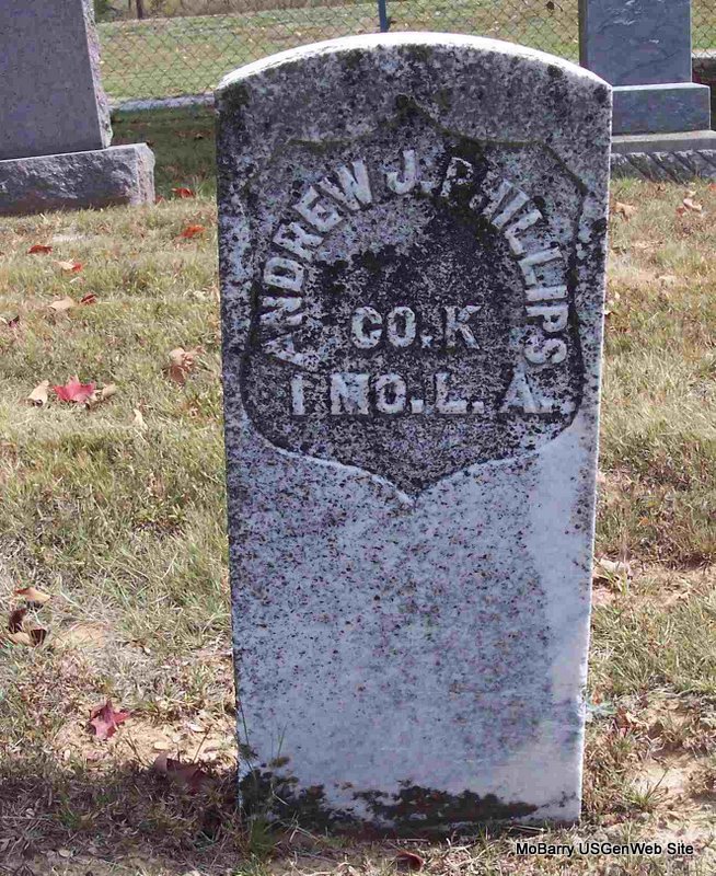 Inscription: "Co K 1 MO L. A." - Research Note: F. A. Kiper of Berryville, AR applied for the military stone on May 6, 1930. - Cassville Republican, Oct. 26, 1893 - A. J. Phillips of Roaring River had a big house raising Tuesday. - January 20, 1910, Cassville Republican - Butler Hollow News: J. H. Brown spent Wednesday night with his father-in-law, A. J. Phillips of Dry Hollow. - March 3, 1910, Cassville Republican - Dry Hollow News: Mrs. M. L. Millsaps from White County, Ark, is visiting her brother A. J. Phillips. - August 20, 1914, Cassville Republican - Eagle Rock News: A. J. Phillips is staying with his daughter and son, T. A. Stapp, at this place. | Online Newspapers Military Headstone App. Phyllis Long Photo Diana Cope |
