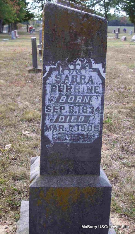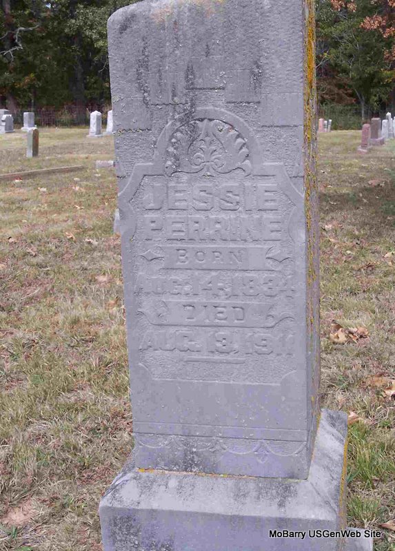Research Note: Civil War Veteran, serving as a sergeant with the 10th MO Cavalry. His father was given as Daniel Perrine and his mother as Catherine Smith. The data reads that he was widowed. Mrs. John R. Wallen (daughter, Ida G.) gave the information. - He was living with John and Ida in the 1910 Census, widowed. - August 10, 1911, Cassville Republican - Fred Perine of Blue Rapids, Kan., Mrs. Lillie Abernathy of Kansas City and Mrs. Florence Morton of Moffatt, Colo., are attending their father, Jesse Perine, who is dangerously ill. - August 17, 1911, Cassville Republican - Card of Thanks: We extend our heartfelt thanks to friends and neighbors who so kindly assisted us during the sickness and at the funeral of our beloved father, Jesse S. Perine, May our Heavenly father bless you all. James Perine, Fred Perine, Mrs. Florence Morton, Miss Lillie Abernathy, Mrs. Malissie Horne, Mrs. Ida Wallen. | Death Certificate Donna Cooper Census Online Newspapers Civil War Records Phyllis Long Photo Diana Cope |
