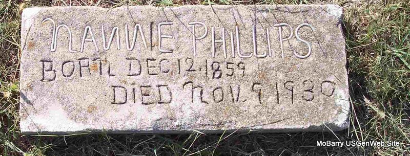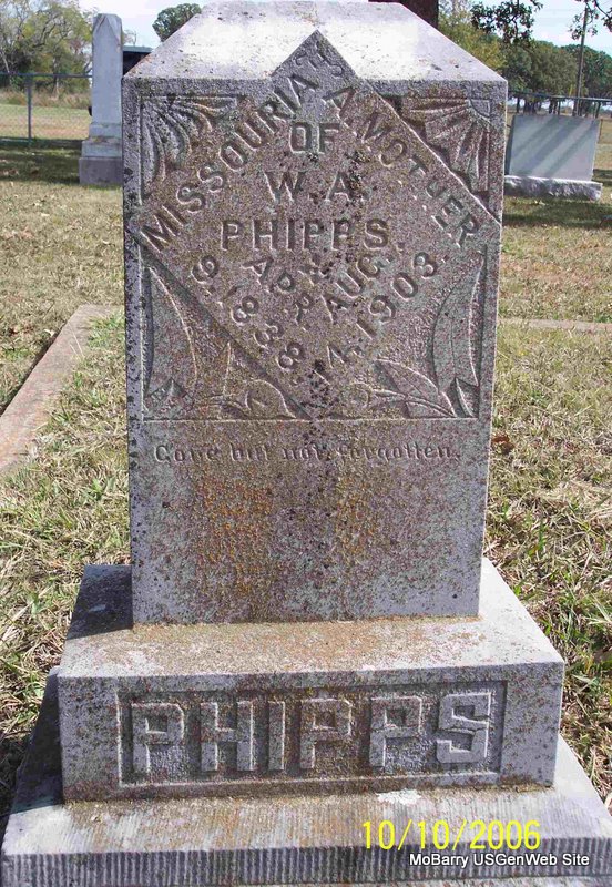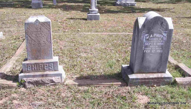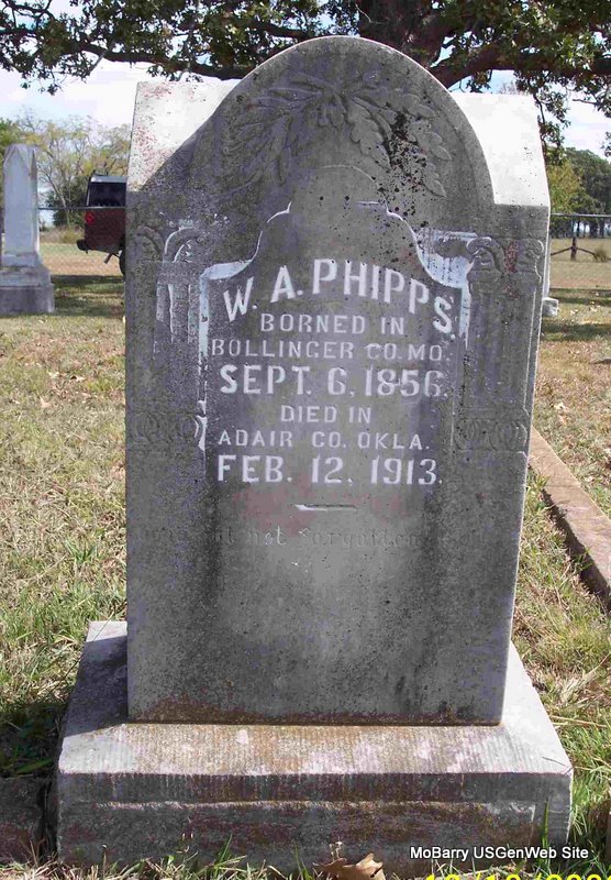 Inscription: "Borned Bollinger Co., MO - Died Adair Co., Okla." - Research Note: Son of William and Missouri Ann Phipps. - 1900 Census, Flat Creek, Barry, Missouri - William A. Phipps, age 43; Missouri A. Phipps, age 64. - 1910 Census, Flat Creek, Barry, Missouri - William A. Phipps is age 54 and single. Living alone. - Phipps Stones | Census Phyllis Long Photo Diana Cope |