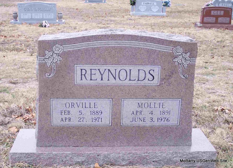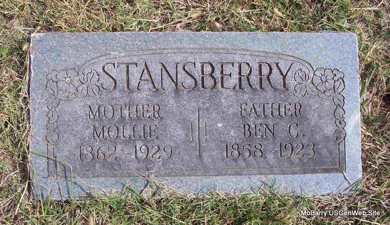 SSW: Ben C. - Inscription:"Mother" - Research Note: Her death certificate listed her husband as B. C. Stansberry. Parents not known. James Stansberry was the informant. - Cassville Democrat, Sept. 20, 1929 - Mrs. Mollie Stansberry died at her home south of Cassville on Sept. 13, at the age of 67 years, 4 months and 29 days. She was the widow of the late R. C. Stansberry and had been a resident of this county for many years. She is survived by three sons and four daughters. Funeral services were held at the Corinth church Saturday afternoon, conducted by the Rev. Vanderpool. Interment in that cemetery under the direction of the Horine Funeral Service. | Death Certificate Online Obit Phyllis Long Photo Diana Cope |