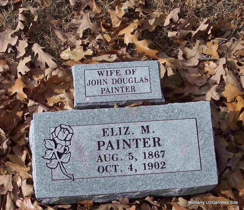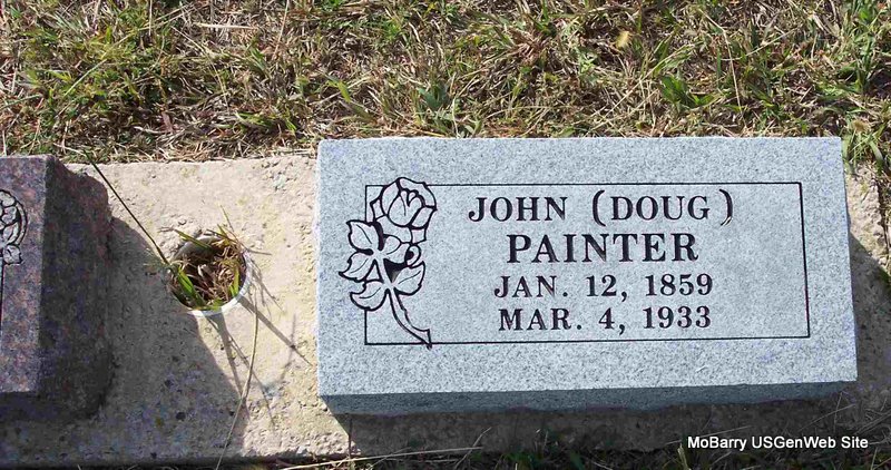 Research Note: Son of John Painter and Mary Fowler. He has a home made tombstone, that did not come out correct in the making, so it is turned upside down in the cemetery. His grandson, Charles Glen Painter, is buried by his side. He was buried Mar. 5, 1933. Beverly posted Feb. 1861 as the birth date, the stone reads otherwise. Beverly states that his obit states he was born 1859. She also stated that the old rock for his marker was removed. She said that the 1900 census has his birth date as Feb. 1861, born in AR. His wife was Elizabeth Mahala (Davenport) Painter and they married March 31,1859. Using the death date given - no death certificate was registered with a Barry County death. - June 6, 1908, Cassville Democrat - For Assault and Battery: Lon and Bill James and Press Beal were arrested Monday, on a charge of having committed assault upon the person Douglas Painter, all living northwest of town, Sunday. Squire Plattenburg issued the warrant. Those fellows could have seen in better business than assaulting Doug Painter. | Note Beverly Matthews Online Newspapers Phyllis Long Photo Diana Cope |
