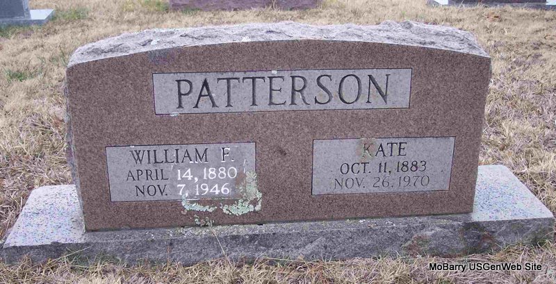 SSW: Kate - Research Note: William's death certificate listed his parents as Horace H. and Dora E. (Rich) Patterson, both born in AR. Mrs. Kate Patterson gave the information. - February 8, 1912, Cassville Republican - Sugar Creek News: Will Pog and J. E. Pog are going to move their saw mill this week to W. F. Patterson's near Sugar Creek. - Cassville Democrat, Feb. 14, 1920 - Mr. and Mrs. W. F. Patterson are moving back to this vicinity. Mr. Patterson visited here once and saw that he must come back. This is too good a place to leave and stay left. | Headstone Death Certificate Kathryn Gebczyk Online Newspapers Phyllis Long Photo Diana Cope |