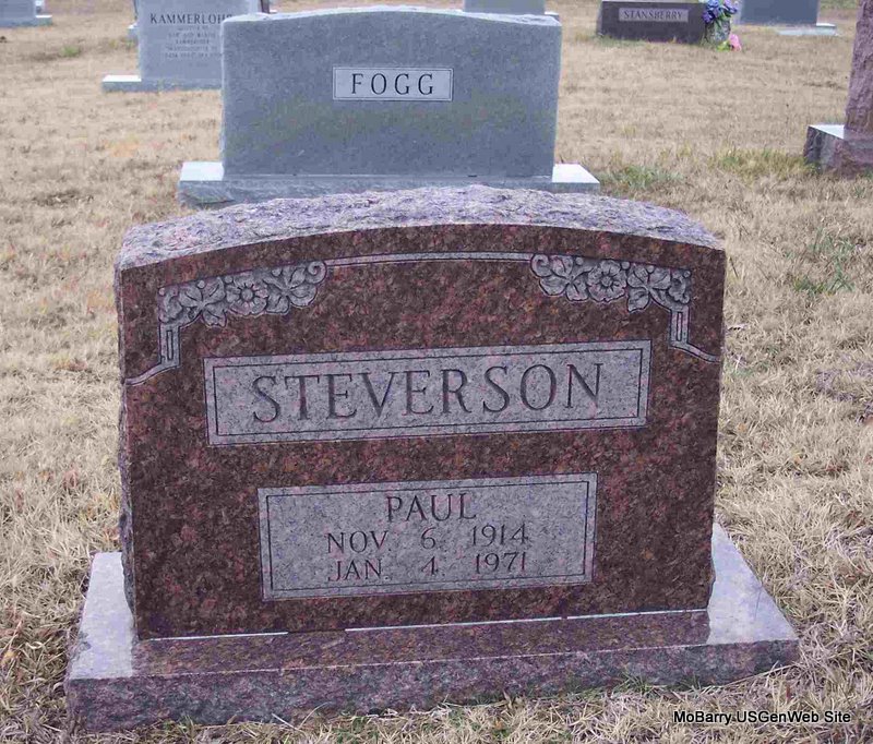 | STEVERSON, Paul | Nov. 6, 1914 | Jan. 4, 1971 | Research Note: John Paul was the son of Warren and Florence (Pippin) Steverson. Paul Steverson, age 25, married Delpha Robinson, age 18, on Dec. 31, 1939 in Garfield, Benton Co., AR. Divorced. | Census AR Marriage Records Phyllis Long Photo Diana Cope |