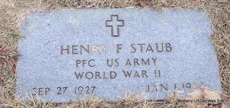 | STAUB, Henry F. | Sept. 27, 1927 | Jan. 1, 1989 | Inscription: "PFC US ARMY WORLD WAR II" - Research Note: SSDI gives his last residence as Exeter, Barry Co., MO. | SSDI Phyllis Long Photo Diana Cope |