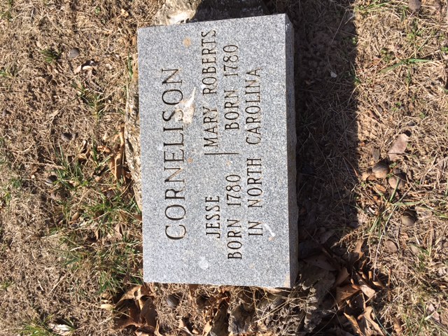 Research Note: Stone has 1780. Wife of Jesse Cornelison. Researchers say she was the daughter of Isaac Roberts and Ann Thomason. - 1850 Census, District 5, Barry, Missouri - Jesse Cornelison, age 70 born NC; Mary, age 62 born NC; Porter, age 19, born TN; Mary A., age 17, born TN. - Mary's Rock - Jesse and Mary's Plot | Note Census Phyllis Long Headstone Brandon Burns Photo Jay Trace |