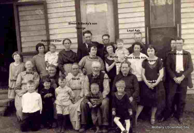Front Row - All Children: Three unknown boys; Dale Long between Giles legs; and another unknown child with white stockings. First Row of Adults: Rebecca "Becky" (McDunner), wife of Simon Hiram Long; George and Sarah (Smith) Long; Giles Lehew "Buddy", son of George and Sarah; and next is probably Lottie J. (Mikles) Long, wife of Giles Lehew. Third Row - Beginning in middle: Tennie; Myrtle; Unknown Child; Chloe Alice (Long) Ash; Margaret - maybe Ash; Jim McCracken, husband of Myrtle Emma Long. Fourth Row: Cora Bell Etter; Unknown Woman holding Raymond Etter - maybe Mary Long?; Unknown Woman with apron on; George Long, son of Simon and Becky; Unknown Boy; Loyad Ash; and man behind Jim McCracken - could be Loyad Ash, Jr.? Photo was taken before 1927 because George Long died in February of that year. Mary Margaret Ash was born in 1913 and she appears to be about 12 to 13 years old, so the photo may have been taken around 1926. Submitted in 2007 by: Donna Cooper |