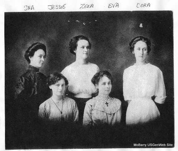1. Ona (1883-1952) She married Ernest Claudius Chumbley. She then divorced him and later married Creed F. Bridgeman. 2. Jessie (1899-1995). She married Oliver A. Jackson. He died, and then she married Harold A. Vanover. 3. Zena (my great-grandma) (1893-1969). She married Charles Elisha Woolsey (my great-grandfather), but then divorced him. She next married Jack Palmer. 4. Eva (1891-1960). She married Walter E. Wallace. 5. Cora Lee (1888-1924). She did not marry. Submitted in 2007 by: Heather E. Blair - This picture was sent to me by Peggy Marsh. |