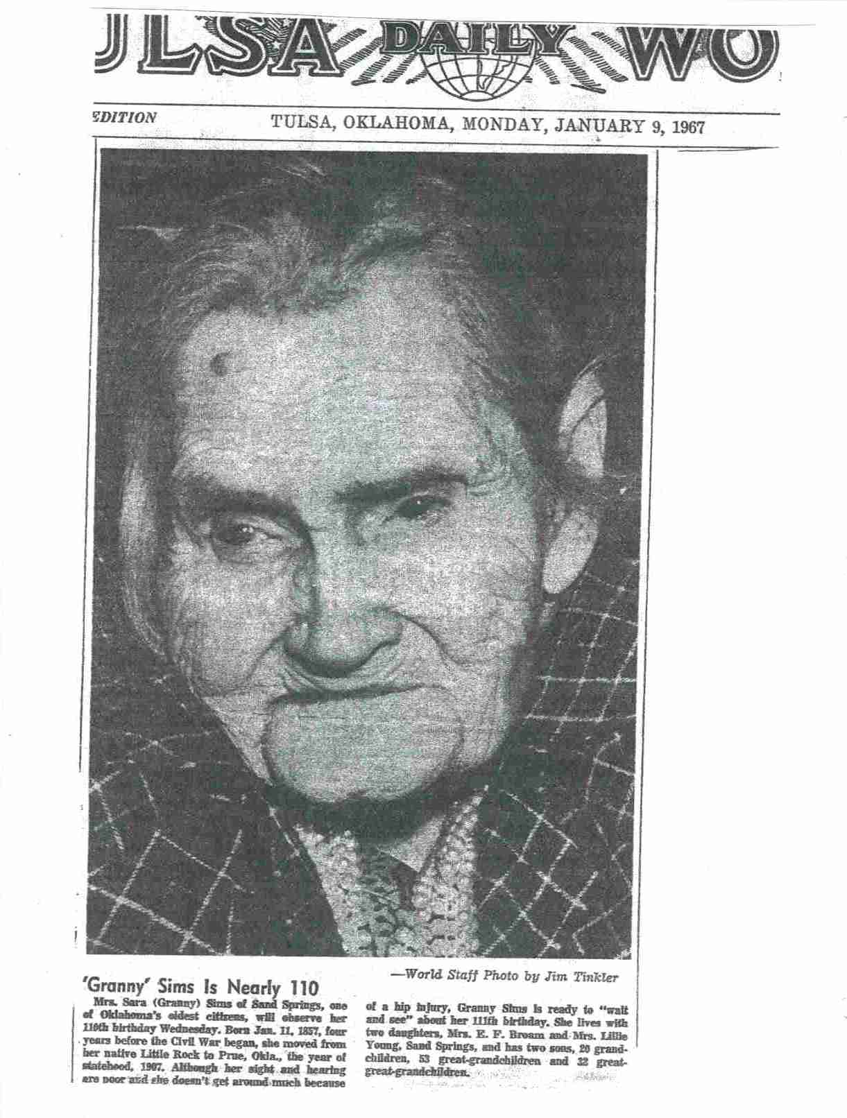 Tulsa World - Nov. 10, 1968 - 'Granny' Sims is Nearly 110 Mrs. Sara (Granny) Sims of Sand Springs, one of Oklahoma's oldest citizens, will observe her 110th birthday Wednesday. Born Jan. 11, 1857, for years before the Civil War began, she moved from her native Little Rock to Prue, Okla., the year of statehood, 1907. Although her sight and hearing are poor and she doesn't get around much because of a hip injury, Granny Sims is ready to "Wait and see" about her 111th birthday. She lives with two daughters, Mrs. E. F. Broam and Mrs. Lillie Young, Sand Springs, and has two sons, 20 grandchildren, 53 great-grandchildren and 32 great great grandchildren. Submitted by: Joyce Snell |