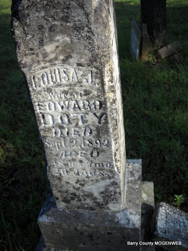 Research Note: Son of Joseph L. Doty and Rebecca Ann Burcham. Civil War Veteran, Pvt., Co. B, 32nd MO Inf., serving 1 year, 2 months, 2 days. He first married Louisa Jane Berry on July 18, 1861 in Barry Co., MO. At age 51, he second married Telitha (Stone) King, age 41, on Dec. 25, 1893, Barry Co., MO. Edward and Telitha were only married a short time and divorced. Telitha first married Joseph M. King and died in OK. Edward and Louisa Jane Berry's son, William Edward is buried in Clio Cemetery according to his death certificate. William Edward's wife was Mabel C. Bennett. | Headstone Irene Coones 1890 Vet. Census Census MO Marriage Records Phyllis Long |
