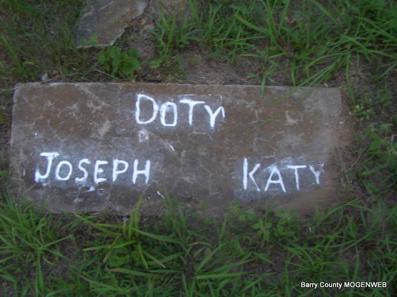 SSW: Katy - Research Note: Homemade Stone - Concrete with Joseph and Katy Doty marked on it. Son of Joseph L. Doty and his first wife, Rebecca Ann Burcham. He first married Elizabeth Meaders, died 1865, and second, Catherine "Katy" Abbott, married Dec. 31, 1865 in Lawrence Co., MO. Jay's Note: Mr. Hicks said that Joseph Doty was a Civil War Veteran along with his brother Samuel and that Samuel is buried on the other side of the cemetery. One was a Confederate and one was a Union Soldier. | Census Phyllis Long Photo Jay Trace |
