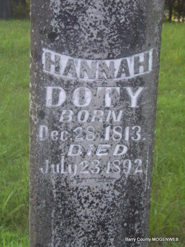 SSW: Hannah Doty - Research Note: Joseph was a son of Samuel Doty and wife Mary "Polly" Lamb. He married first Rebecca Ann Burcham on May 11, 1823 in Greene Co., IN, and his second wife was Hannah H. Sparks, and they married June 20, 1845 in Taney Co., MO. Rebecca Ann Burcham was born in NC, 1804 and is thought to have died 1844. | Note Photo Jay Trace |