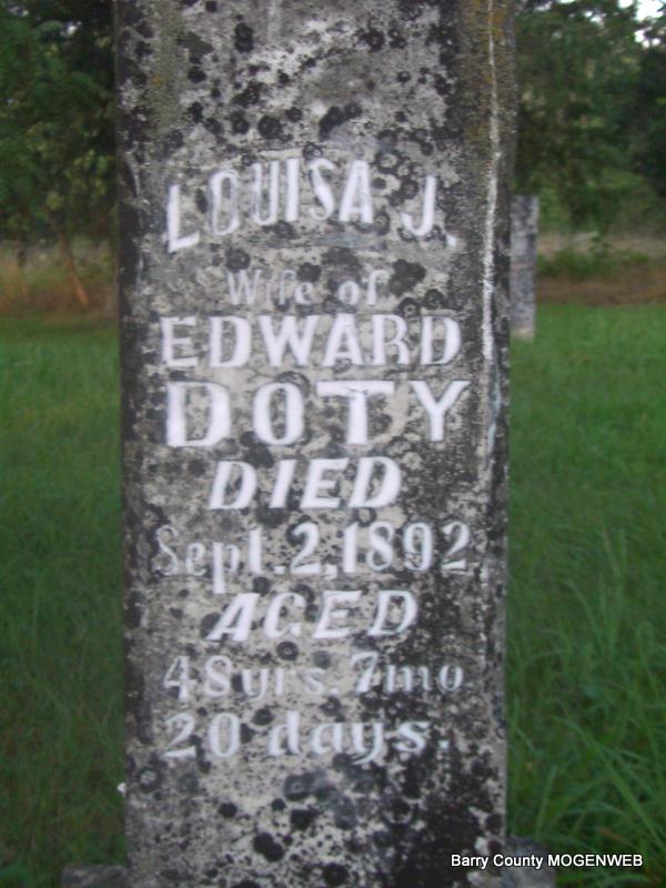 | DOTY, Louisa Jane (BERRY) | Jan. 22, 1844 | Sept. 2, 1892 | Inscription: "Aged 48 yrs., 7 mo., 20 days, wife of Edward Doty" - Research Note: First wife of Edward Doty. Daughter of Zephaniah Berry and Susan Williams. - Another Photo | Census Phyllis Long Photo Donna Cooper Photo Jay Trace |