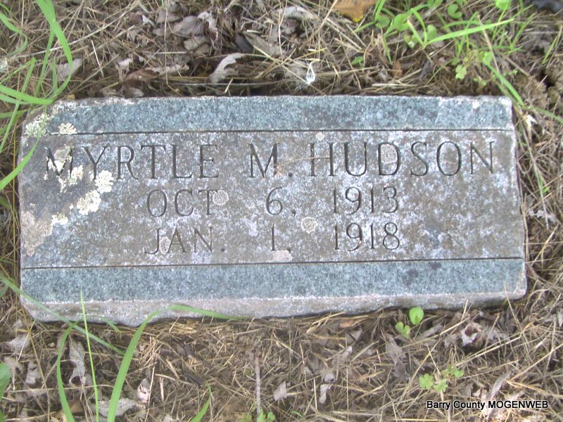 | HUDSON, Myrtle M. | Oct. 6, 1913 | Jan. 1, 1918 | Research Note: According to funeral home record, died of flu and pneumonia at age 5 years, 3 months. Daughter of James William Hudson and Sarah Hannah Doty. | Headstone Irene Coones King Funeral Home Photo Jay Trace |