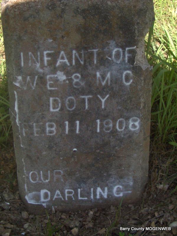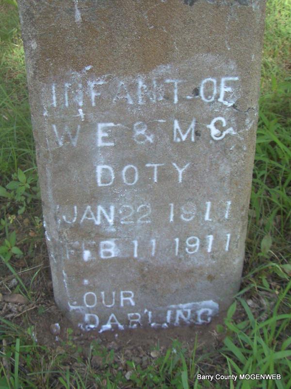Inscription: "Infant of W. E. and M. C. DOTY" "Our darling" is inscribed at the bottom. His death certificate gives listed his birth date as Jan. 21, 1911 and his death date as Feb. 10, 1911. His father was given as William E. Doty, born in Flat Creek, Barry Co., MO, and his mother was listed as Mabel Bennett born in Douglas Co., MO. D. F. Coones gave the information. - Feb. 16, 1911, Cassville Republican - Clio News: Will Doty's little baby died Saturday and was buried Sunday at the Doty Cemetery. | Headstone Irene Coones Death Certificate Donna Cooper Online Newspapers Phyllis Long Photo Jay Trace |