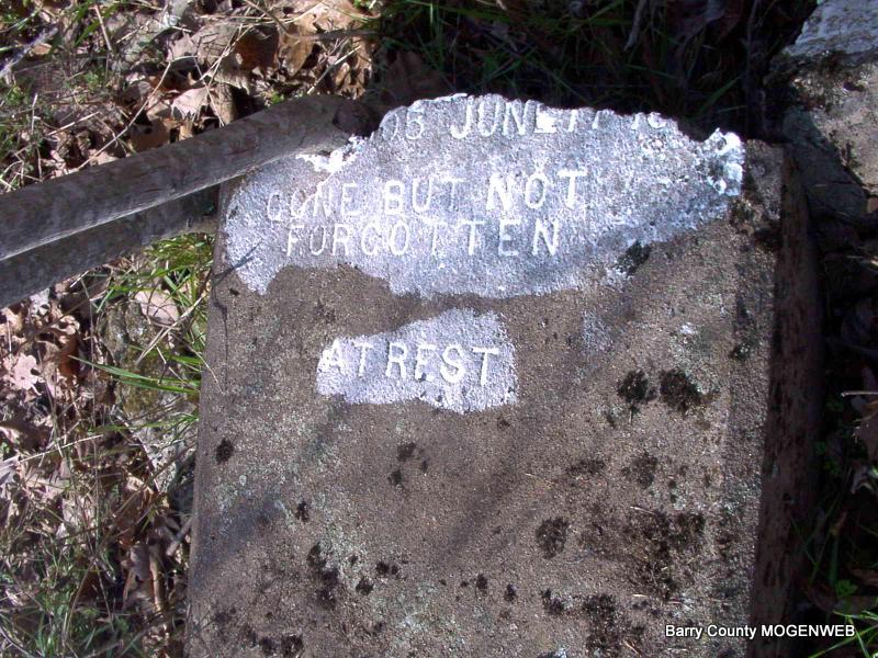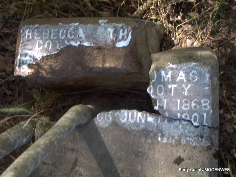 SSW: Rebecca - Research Note: Son of Edward Doty and Louisa Jane Berry. Rebecca Bolin, age 18, married Thomas Doty, age 23, on Feb. 4, 1892 in Mountain Twp., Barry Co., MO. - Broken Stone - Jay's Note: This was the most interesting find of the day. If you walk west of the cemetery, across Mr. Hicks' driveway, and down the creek bank a little you find this broken stone. It's a stone for Thomas and Rebecca Doty. - Another Photo | Headstone Irene Coones Census MO Marriage Records Phyllis Long Photo Jay Trace |