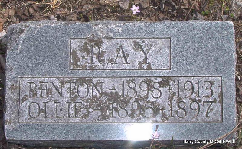 | RAY, Ollie Melvina | Apr. 9, 1895 | July 22, 1897 | SSW: Benton - Research Note: Daughter of Ellsworth W. Ray and Martha Elizabeth (Coones) Ray; drowned when she fell into a pail of water. - Cassville Republican, July 29, 1897 - Mr. and Mrs. Ray of Lower Rock House lost a child Friday by drowning in a tub of water. | Online Obit Phyllis Long Photo Jay Trace |