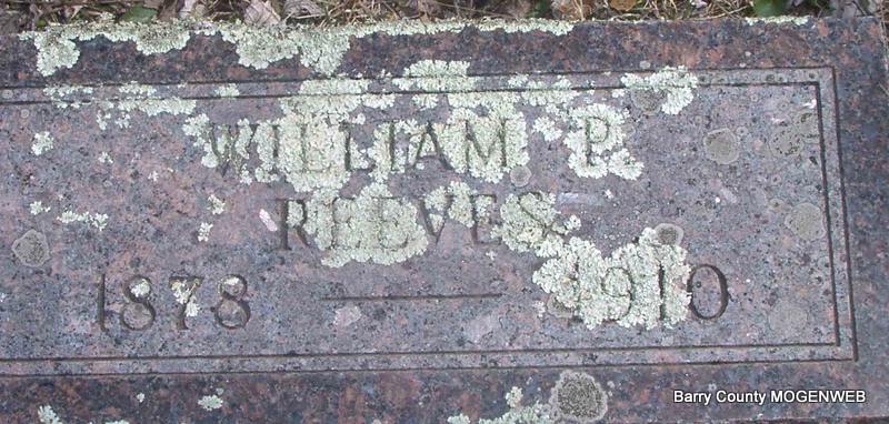 Research Note: Spelled "Reaves" in Funeral Home Record. Died of pneumonia, was married at time of death. - Death certificate has Mar. 20, 1910, Barry County death and surname spelled Reaves. Stone only has year of birth and death engraved on it. The death certificate reads that his parents were John Reeves, born MO and his mother Sallie Solomon born MO. Luly Reynolds, Mineral Springs, MO, was the informant. His wife was Susan Alice Doty and they married in Barry Co., MO, Aug. 1, 1899. His death certificate gives his place of burial as Wilson Cemetery. | Death Certificate MO Marriage Records Donna Cooper King Funeral Home Photo Jay Trace |
