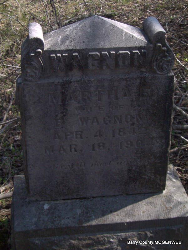| WAGNON, Martha E. (BURKETT) (CLANTON) | Apr. 4, 1842 | Mar. 18, 1904 | Inscription: "Wife of B. Wagnon, Till we meet again." - Research Note: Daughter of John J. Burkett and Louisa Mary Murray. She first married Harrison Clanton March 13, 1858 in Crawford County, Arkansas. She second married Benjamin Wagnon July 26, 1866 in Lawrence County, Missouri. Benjamin is buried at Oak Hill Cemetery. | Headstone Marie DeMoss Marriage Records Census Phyllis Long Photo Jay Trace |