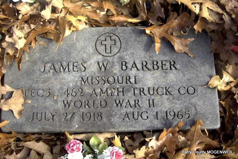 | BARBER, James W. | July 27, 1918 | Aug. 1, 1965 | Inscription: "Missouri Tech 5, 462 AMPH Truck Co., WW II" - Research Note: Son of Wilson Elijah Barber and Margaret Elizabeth Gray. James W. Barber, age 28 of Eureka Springs, AR, married Pearl Marie Towler, age 21 of Eagle Rock, MO, on Sept. 14, 1946 in Carroll Co., AR. | Census AR Marriage Records Phyllis Long Photo Note Darla Ball Marbut |