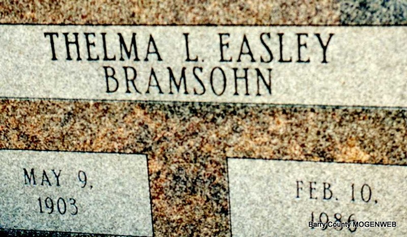 | BRAMSOHM, Thelma L. (EASLEY) | May 9, 1903 | Feb. 10, 1986 | Research Note: Thelma (Easley) Bramsohn was a daughter of Charles and Lillie Mae (Farwell) Easley. She married to Morris Bramsohm. Thelma Lillian (Easley) Bramsohm's grand parents were Edward and Sarah Elizabeth (Russell) Easley. Her great grand parents were Green Barry Easley and his wife Evaline Johnson. Her brothers and sisters were Avesta Arizona Easley (Mrs. Joseph Silas Ball), Henry Floyd Easley, Homer Easley, Truda Lucille Easley (Mrs. Emmett Gallagher), Minnie Easley (Mrs. Ermal Williamson), Everett Morse Easley, Maudy Mae Easley and Rayburn Edward Easley. | Photo Note Darla Ball Marbut |