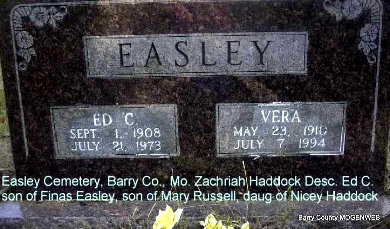 Research Note: Darla's grandpa. - Darla's Note: Edward "Ned" Easley married Mary Elizabeth Russell a daughter of Milo and Nicey (Haddock) Russell. Edward's parents were Green Berry and Eveline (Johnson) Easley. Edward's brothers and sisters were: Christopher Columbus Easley, William Easley, Martin Vanburen Easley, Sarah J. Easley (Mrs. John Jackson Wallen, Jr.), John Easley, Green Berry Easley, Jr., Hulda Jane Easley (Mrs. James Madison Lee), Mary Elizabeth Easley (Mrs. William Alford Lewis), Robert Easley, Austen Lee Easley and C. Eveline Easley. - Uncle Ned Easley Dies Sunday Morning: Age 91 Years - Honorable Barry County Man born on Farm Near Home Where He Died - Uncle "Ned" Easley, one of the Barry County's oldest citizens passed away Sunday morning at 8 o'clock at his home on White River, near Eagle Rock, following an illness extending over the past few months. Ninety-one years and seven months ago, this excellent character was born on a farm on White river, a short distance from his home where he passed away. Ever since that time he has been a resident of this county, living in the same neighborhood where he was born. He had lived on his present farm since the year 1865. In that same year, Uncle Ned, as he was familiarly known, was united in marriage to Miss Mary Russell to which union 9 children were born. He was survived by Charles, Finis, Floid, Mrs. Henry Maloney (Molly), Mrs. William Tucker (Arizona), and Mrs. Same Skelton (Lona) all of whom reside in this county. Mrs. Easley's excellent wife preceded him in death 9 years ago, since which time his son, Floid, and family, have made their home with him on his farm at the mouth of Roaring River. - Grandfather Edward's older brother, Christopher Columbus Easley had died in a very cold and icy winter. When the family tried to get the horse drawn wagon up the hill to the Old Easley Cemetery where their parents, Green Berry and Eveline Johnson Easley were buried, they could hardly make it. Edward Easley lived across White River from the Old Easley Cemetery (also called Hickam/Hickum) and just crossing the river in the winter was difficult. Some say that as the wagon climbed the icy hill, the casket slide out. So after Grandfather Edward and family had such a difficult time burying Christopher, he made the comment, "As for me and mine, we'll be buried with the soldiers." On what was once his father's land and was later his brother's land, some Civil War Soldier had been buried. As the Civil War was between 1861 and 1865, the cemetery had been started in those years. It became the Easley Cemetery and is near Eagle Rock, Mo. We believe that the 7 fieldstones in line in the same row with Grandfather Edward, his son, Edd, and his wife Mary Russell Easley are those 7 soldiers. As Grandfather Edward was a Union Soldier himself, we are pretty sure these are Union Soldiers as he definitely wouldn't have wanted to be buried with Southern Soldiers. The reason I think this story is important that it gives us some idea of about when the Easley Cemetery was established and that the 7 graves are of union soldiers. | Online Obit Online Newspapers Family Note Darla Ball Marbut |