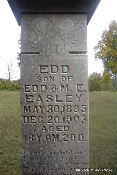 Inscription: "Edd son of Edd and M. E. Easley - May 30, 1885 - Dec. 20, 1903, Aged 18Y, 6M, 20D" - Research Note: Edward was the son of Edward and Mary E. (Russell) Easley. Little Ed went to his sisters, Arizona, Mrs. William Tucker's, to help her because her husband "Bill" had typhoid fever. Bill recovered but Little Ed caught it and died. | Photo Note Darla Ball Marbut |