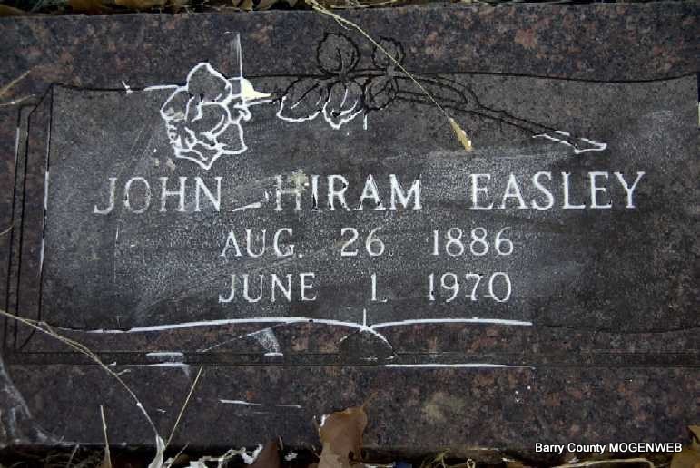 Research Note: John Hiram Easley was a son of John and Martha (Robbins) Easley. He married Rebecca Tucker. Divorced at the time of his death. He lived at 1009 Harold St., Cassville, MO. Loren Easley of rural Cassville, MO was the informant on the death certificate. John Hiram Easley and Rebecca (Tucker) Easley's children were Roman Easley, Bertie Easley, Violet Easley, Juanita Easley (Mrs. Leon Vinson) and Christopher Columbus Easley. | Death Certificate Phyllis Long Photo Note Darla Ball Marbut |