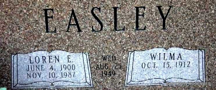 SSW: Loren E. - Inscription: "Wed Aug. 25, 1949" "Well done faithful servant, enter into the joy of the Lord. Matt. 25:21" - Research Note: Wilma Fern Thomas was born Oct. 15, 1912 the daughter of Eugene Harrison Thomas and his wife Rebecca Ann Bolton. Her brothers and sisters were Jewell Glen Thomas (Mrs. Herbert Williams), Opal Gail Thomas (Mrs. Carl Pennel), Wayne Thomas, Efton Harrison Thomas, Edna Faye Thomas (Mrs. Delmer Burl King), Loretta Mae Thomas. Wilma married Loren E. Easley and they had one son, Loren "Edwin" Easley. Wilma's paternal grandparents were James Asbury Thomas and his wife Harriett Roena Whittington. Her maternal grandparents were Josiah W. Bolton and his wife Mary Simpson. - She was the daughter of Eugene H. and Rebecca Ann (Bolton) Thomas. On August 25, 1949 she was united in marriage to Loren E. Easley, who preceded her in death on November 10, 1987. Also preceding her in death were her parents, two brothers, Wayne Thomas and Efton H. Thomas and four sisters, Glenn Williams, Loretta Thomas, Opal Pennel and Edna F. King. Surviving are two sons, Edwin Easley and his wife Phyllis of Cassville, Missouri and Dr. James Easley and his wife Marilyn of Sealy, Texas; one daughter, Billie Joe Crotts and her husband Lynn of Nixa, Missouri. Wilma grew up and spent most of her life in Barry County, spending seven years in Texas and eighteen months in Idaho. She attended school in Barry County and two years at Clay Hill High School then continued her education at Southwest Baptist College. For twenty years she was the Librarian at Cassville Schools and also worked in the book mobile before retiring. She was a member of First Baptist Church in Cassville. | Photo Note Darla Ball Marbut Fohn Funeral Home Phyllis Long |
