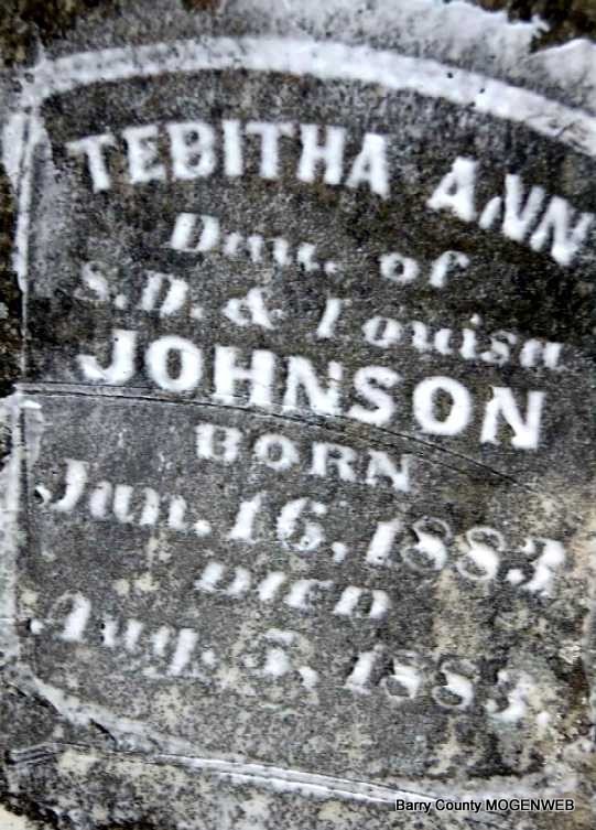| JOHNSON, Tabitha Ann | June 16, 1883 | Aug. 5, 1883 | Research Note: Tabitha Johnson's twin brother was Charlie B. Johnson b. June 16, 1883 d. Oct. 12, 1883. | Photo Note Darla Ball Marbut |