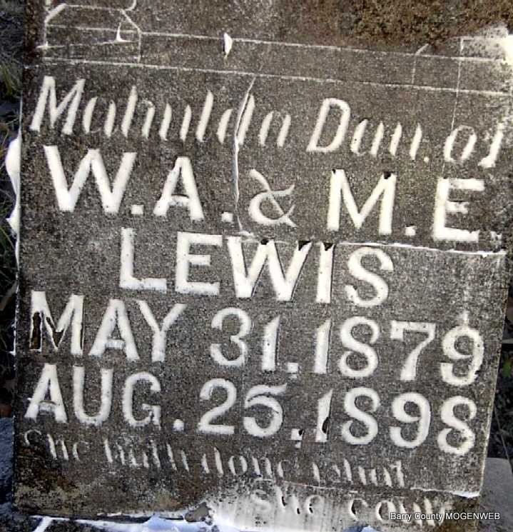 | LEWIS, Mahulda | May 31, 1879 | Aug. 25, 1898 | Inscription: "Our Daughter - Dau. of W. A. and M. E." - Research Note: Daughter of William Alford Lewis and Mary Easley. | Photo Note Darla Ball Marbut |