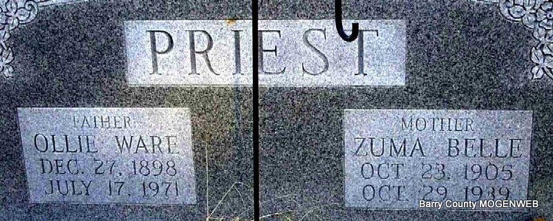 SSW: Zuma Belle - Inscription: "Father" - Research Note: Son of Robert Hughey Priest and Martha Jane Robertson. Residence was 1405 Regan St., Carthage, MO. Charles E. Priest of Washburn, MO was the informant on the death certificate. | Death Certificate Phyllis Long Photo Note Darla Ball Marbut |