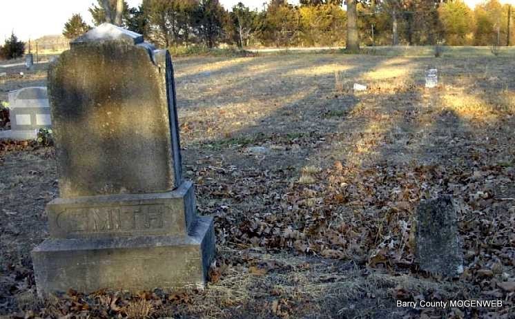 Research Note: Listed as a Civil War Veteran in the 1890 Census, Roaring River, MO. - 1880 Census, Carthage, Jasper, Missouri - James J. Smith, age 56, born OH, parents born OH; Susan, age 32, wife, born MO, parents born PA; Bainbridge, age 16, son, born MO; Susan, age 14, daughter, born MO; Amanda, age 13, daughter, born MO; Decatur age 10, son, born MO; Rosa, age 8, daughter, born MO; Anna, age 4, born MO; Sherman, age 2, son, born MO. - 1900 Census, Roaring River, Barry, Missouri - James J. Smith, head, born Dec. 1824 KY, age 75, married 38 years, father born TN, mother KY, farmer; Susan W., wife, born May 1836 MO, age 64, married 38 years, mother of 7 children, 7 living, parents born Delaware; Sherman, son, born Jan. 1879 MO, age 21, single. - 1910 Census, Roaring River, Barry, Missouri - Susan W. Smith, age 67, born MO, parents born PA; Sherman, age 27, son, born MO. Susan is probably buried here. - James filed for his Veteran pension on Nov. 26, 1879. Susan filed on Nov. 17, 1906. - Another Photo | Census Civil War Records Phyllis Long Photo Darla Ball Marbut |