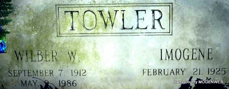 | TOWLER, Wilber W. | Sept. 7, 1912 | May 9, 1986 | SSW: Imogene - Research Note: Wilbur Towler's full name was Walter Wilbur Towler son of Charles Nathan and Bessie (Shrum) Towler. He married Imogene Gautney. | Photo Note Darla Ball Marbut |