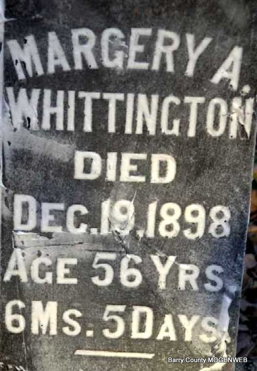 | WHITTINGTON, Margery A. (MALONEY) | June 14, 1842 | Dec. 19, 1898 | Inscription: "Age 56 yrs, 8 ms, 5 days" - Research Note: Born June 14, 1842 (Maloney Bible) daughter of John and Lucinda Whittington Maloney, married John Whittington, son of Benjamin and Harriett (Stringer) Whittington. | Photo Note Darla Ball Marbut |