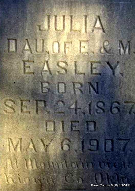 Inscription: "Julia dau. of E. and M. Easley born Sept. 24, 1867, died May 6, 1907 in Mountain View, Kiowa Co., Okla. She was the sunshine of our home, gone to a bright home, Jesus has come and borne thee home, beyond the stormy blast, thy memory shall ever be a guiding star to heaven." - Research Note: Daughter of Edward Easley and Mary Elizabeth Russell. Darla's Note: Julia Easley married William Williams Feb. 21, 1886 in Barry Co., MO, and their children were: William C. Williams, Clarence W. Williams, Charles Richard Williams, Bessie Mae Williams (Mrs. William Evans), Jessie Eveline Williams (Mrs. Ernest Lewis Summers), Nora Arizona Williams (Mrs. Francis Staton), Mary Magdaline Williams (Mrs. Merl Hannah), Perry Elihu Williams, Hiram Edward Williams, and Lulie Edna Williams. | Online Obit Online Newspapers Note Darla Ball Marbut |