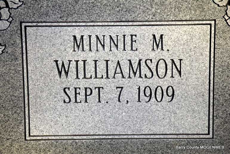 | WILLIAMSON, Minnie (EASLEY) | Sept. 7, 1909 | Dec. 5, 2005 Red Rose Inn, Cassville, Barry Co., MO |