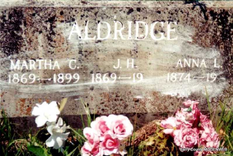 SSW: Martha C. and Anna L. - Research Note: Son of James Monroe Aldridge and Matilda J. Hensley. - Nov. 13, 1909, Cassville Democrat - November Grand Jury - Short Biography of the Member of the Jury: James Harvey Aldridge of near Mano, Roaring River township, was born March 1, 1869, where he resides. Has been married twice; first November 13, 1887 to Miss Martha Wise, who died July 22, 1897. Was married to Miss Anna L. Sparks of Golden, April 13, 1901. Has five children by first marriage and one son dead. He is a farmer and is getting along nicely. He is a member of the Baptist Church and a Republican in politics. State Historical Society of MO - His death certificate lists Monroe Aldridge as his father, born TN, and Matilda as his mother. His wife was given as Annie Aldridge and Annie Aldridge, Star Route, Eagle Rock, MO, gave the information. | Headstone Frank Williamson Online Newspapers Death Certificate Donna Cooper Census Phyllis Long Photo Darla Marbut |