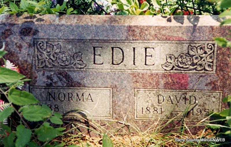 Research Note: William Joseph Edie married Martha Frances Aldridge on Jan. 1, 1874 in Barry Co., MO. Son of David Edie and Matilda Kleinhenn. - 1870 Census, Lowell, Cherokee, Kansas - David Edie, age 45, farmer, born OH; Matilda, age 42, born England; William J., age 16, born OH; Matilda, age 6, born OH - 1880 Census, Roaring River, Barry, Missouri - William Edie, age 27; Martha, age 24; Alice, age 5; Ida, age 2; Monroe, age 1 - 1900 Census, Roaring River, Barry, Missouri - William J. Edie, head, born June 1853 OH, age 46, married 25 years, father born OH, mother England; Martha F., wife, born July 1855 MO, age 44, married 25 years, mother of 8 children, 7 living, father born NC, mother MO; Monroe T., son, born Apr. 1878 MO, age 21, single; William D., son, born Oct. 1881 MO, single, age 21; Levi F., son, born Dec. 1887 MO, age 12; Charles N., son, born Oct. 1892 MO, age 7; Lena I., daughter, born Apr. 1898 MO, age 2; David, father, born Sept. 1825 OH, age 74, widowed, parents born PA; Martha Alice Wisdom, daughter, born Oct. 1874 MO, age 25, married 7 years, mother of 5 children, 4 living; John A. Wisdom, son-in-law, born Feb. 1856 MO, age 44, married 7 years, farmer; Julia M., granddaughter, born Sept. 1885 MO, age 4; Lulu E., granddaughter, born Aug. 1897 MO, age 2; Dora C. (twin), granddaughter, born Jan. 1900 MO, age 4 months; Ora J. (twin), granddaughter, born Jan. 1900 MO, age 4 months. - 1910 Census, Roaring River, Barry, Missouri - Martha has died, William J. Edie, age 56; Levi, age 22; Charley, age 17; Lena, age 12 - 1920 Census, Roaring River, Barry, Missourii - William J. Edie, age 65; Levi, age 32; Charley, age 27; Lena, age 22; Effie, daughter-in-law, age 27, born MO; Gladys, age 7, granddaughter; Joseph, age 6, grandson. - 1930 Census, Roaring River, Barry, Missouri - William J. Edie, head, age 76, widowed; Ida Wisdom, daughter, age 53, widowed, married 17 years, born MO; Horace E. Wisdom, grandson, age 30, single, born MO, farm laborer. - 1940 Census, Roaring River, Barry, Missouri - William David Edie, head, age 57, born MO, blacksmith; Norma, wife, age 51, born MO; Dowell James, son, age 18, single, operator and truck drive on milk route, born MO; William, father, age 82, widowed, born OH. | Census MO Marriage Records Phyllis Long Headstone Frank Williamson Note Donna Cooper |