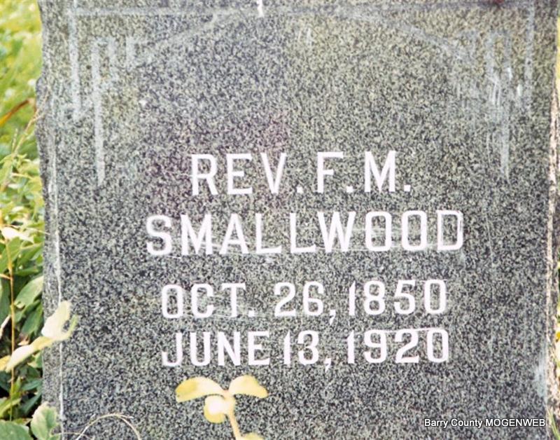 Research Note: Francis Marion Smallwood married Susan Aldridge, May 16, 1886 in Barry Co., MO. She died March 16, 1913 and was born June 18, 1842 in Caswell Co., NC, and was a daughter of Andrew Bolen and Patricia (Melton) Aldridge. She had been married before and was Susan Birkes at the time that they married. He had also been married before and Nancy, his wife, is also buried here. He married Nancy Ray on July 21, 1870 in Lafayette Co., MO. His death certificate gives very little information but does state that he had lived at Mano and was a farmer who died from the effects of prostrate trouble. - Cassville Democrat, June 19, 1920 - REV. F. M. SMALLWOOD DEAD - A real good man and citizen has fulfilled earth's mission and his spirit has been wafted to that haven of sweet rest in the Glory land on high there to bask in the sunlight of his dear Savior who promised him eternal life, for accepting the mission he has so faithfully worked for and rendered a splendid accounting therefore. Rev. F. M. Smallwood died at Springfield, Sunday, June 13, after an operation for prostrated glands, aged 69 years, 7 months and 17 days. The remains were shipped to this city Monday morning and on their arrival here, taken to the home of Dr. D. L. Mitchell and thence to his late home near Mano, and were accompanied by Dr. Mitchell, Elisha Shaffer, a daughter and a granddaughter. He was a Baptist Minister and had preached throughout Barry county for many years and taught the doctrines of his belief, with a zealousness and earnestness, pointing the way for many to a better life. Funeral services were held at Rock Creek Baptist Church, by Rev. Wm. Kennedy, Tuesday, June 15, at 11 a. m., after which the remains were interred in Aldridge Cemetery. He is survived by his wife, a daughter and son. A large number of people attended the funeral services to pay the last tribune of respect to a good man and citizen. - BIOGRAPHY - June 26, 1920, Cassville Democrat - Rev. F. M. Smallwood was a son of late Wm. H. and Sarah J. Smallwood and was born in Callaway county, MO., Oct. 26, 1850. He moved with his parents to Saline county, Oct. 27, 1865 where he grew to manhood and was married to Miss Nancy L. J. Ray, July 21, 1871. To this union six children were born, three dying in infancy; two daughters and one son lived to be grown. Mrs. Shaffer of near Mano, and Mrs. Maggie Baze of Ada, Okla., and E. L. Smallwood, when last heard lived at Halleyville, Okla. Rev. Smallwood came to Barry County, April 11, 1883, and located near Mano, where Mrs. Smallwood died March 29, 1884. On May 12, 1885, he was married to Susan Frances Burks, who died March 16, 1913. On Oct. 20, he and Mrs. Sarah Mismier were married. He experience a living faith in Christ in 1880, and united with the Rock Creek Baptist Church in 1885, and was ordained by that church in the work of the gospel ministry in 1891, and was in the active church work of the gospel ministry of Barry county Baptist Association for 25 years. | Headstone Frank Williamson Note Death Certificate Donna Cooper Online Obit MO Marriage Records Phyllis Long Photo Darla Marbut |