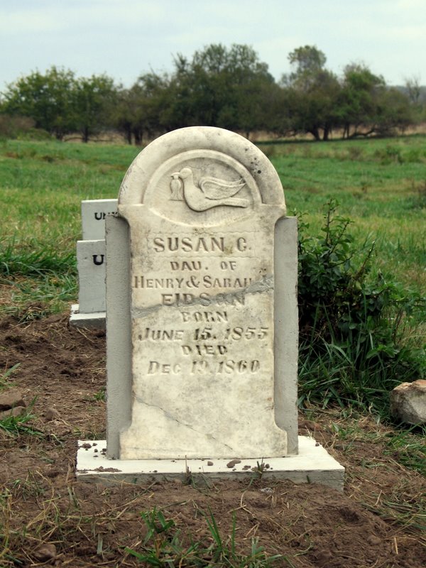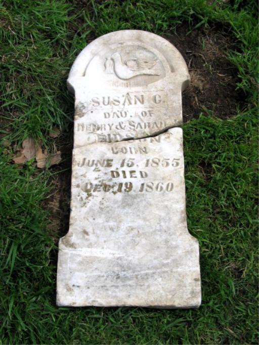| EDISON, Susan C. | June 15, 1855 | Dec. 19, 1860 | Inscription: "Dau. of Henry & Sarah Eidson" - Restored Stone | Photos Jack Fly |
