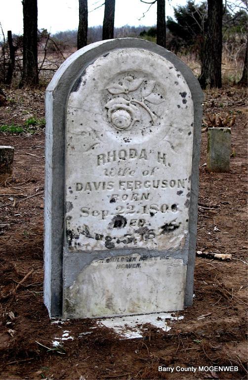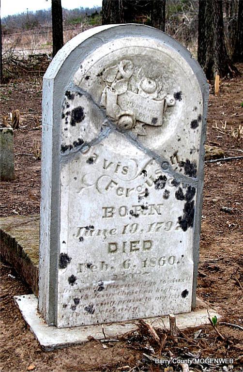 | FERGUSON, John | Abt. 1838 | 1860 | Research Note: He was a son of Davis and Rhoda H. (Rogers) Ferguson. Death date established from the 1860 Newton County, MO, Mortality Index. | Note Headstone Photo Jack Fly |