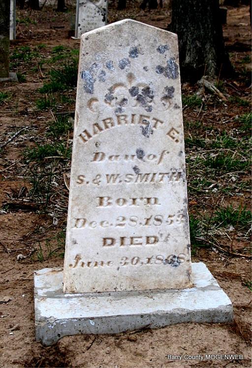| SMITH, Harriett | Dec. 28, 1853 | June 30, 1868 | Research Note: Harriet E. Smith, Dau. of S. and W. Smith. | Note Headstone Repair Photo Jack Fly |