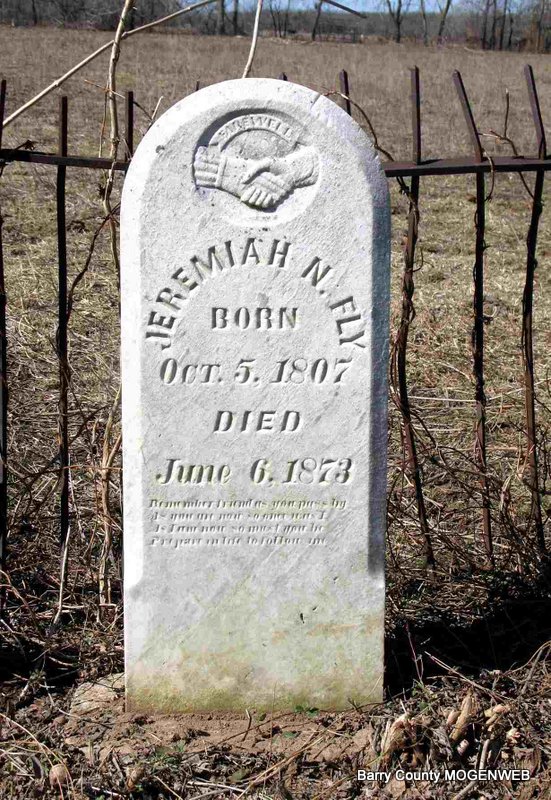 Research Note: Jeremiah Nicholas Fly died June 6, 1873. He was laid to rest next to his son. A prominent figure in early Barry County, Jeremiah N. Fly was a Justice of the Peace from 1842 to 1848, served as Sheriff and Collector from 1852 to 1856, and held the position of County Judge from 1856 to 1860. | Jack Fly |