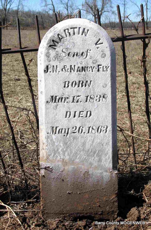 | FLY, Martin Van Buren | No Date | May 26, 1863 | Research Note: Martin Van Buren Fly, son of Jeremiah Nicholas Fly, was the first to be buried there May 27, 1863. On the night of May 26, 1863, men rode up in front of the Fly home near Verona and called him out of the house. When Martin opened the door Bushwhackers shot him down. The following day his mother, Nancy Oakley Fly, drove a wagon pulled by oxen to Verona to bring his body home. He was buried in the corner of the yard. | Jack Fly |