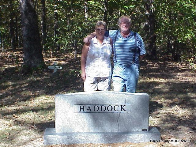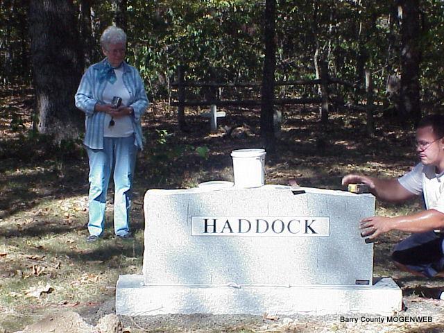 It was a sunny and clear end of summer day when we pulled out of the driveway on an early Tuesday morning 9-21-04. Mary and I live in Greasy Creek Holler, as it's known here in Barry County. We were on the short drive across the hills to Eagle Rock. The night before we had received a call from Darla Marbut (a distant Haddock cousin) and she told us that the Haddock Stone was ready to be delivered and set the next day. It had all started in the spring when several members of the family had decided that a stone should be acquired for the old Haddock Cemetery at Eagle Rock Missouri. A collection of money had been taken up over the course of the summer and a wonderful number of family members had donated. The reason for this stone is that many members of the Haddock family are buried in this cemetery that was located on there own land and most of them had their grave's marked with a simple fieldstone and their name scratched into the stone. This might sound a little crude today but in the middle 1800's it was just the way things were done as the money and or the means to import a store-bought stone just didn't exist. There were few roads and to have a stone brought in by boat was indeed expensive. With time, the stones weather and the writing fades away and we are left with a smooth stone and no information. From old family Bibles and by word of mouth we know about several of the Haddock's that were buried in this old cemetery from 1838 to about 1910 in unmarked graves. From looking at the clearly defined graves there must be at least 40 or 50 that you can see when you look. The property that the cemetery is located on was of course Haddock land in the early days and then the Haddocks all moved out about 1908 and the land ended up in the hands of the Thompson family. Our Aunt Minnie, (Charles Haddock's sister) married into the Thompson family and I would guess that was the main reason that the land became theirs. About 1964, Jack Smith bought the land and decided to give 5 acres to his brother-in-law Marc Schwartz. When pointed out by Darla Marbut he found the cemetery up behind his house and soon found that several people thought it was an important place and of great interest. Marc worked many days to clean the brush and undergrowth so that it looked like someone cared. He then began to cast concrete crosses to mark the graves that he could see. We all owe much to Marc for preserving the cemetery and allowing all of us to visit. Mary and I had to drive on Highway 112 to Roaring River Park and then across to Highway 76 and then to Eagle Rock. Instead of going to the Park, I like to cut across on Sugar Camp Road that comes out at Eagle Rock. The reason is that this road is an old wagon ridge road that winds along the ridge and has a terrific view on both sides. In the 1800's they liked to build roads on the ridges and that way the road was less likely to wash out and they didn't have to build bridges to speak of. Much of the valley or as they are called down here, Holler areas along this road for a mile or so, all belonged to the Haddocks long ago and I just love to look at it. Just before you reach Eagle Rock we turned right onto a smaller road and after only a few hundred yards, all of the land on both sides of the road is where the Haddocks lived and worked for so many years. I truly love to look at this land, when I was a youngster my Grand Pa Charlie would bring me down here and show me the small fields that he helped to clear as a young man and even told me how they managed to get it done. The Haddocks all had large families and would work as a group most of the time. Several of the men would gather just after dawn, already having done the milking and had a big breakfast. Each would have a crock jug of spring water wrapped in a toe sack (burlap) that had been wet down. Along with a team of mules they would move to the fields and begin to work. After a tree had been felled the stump had to come out. They would have a couple of men with long pry bars on one side of the stump and hook the mules to the stump with chain on the other side. It was hard, nasty work and never seemed to end as New Ground was needed about each year and that was the only way to get it. After the stumps where gone it was time to start on the rocks and there were plenty of those. A sled was hooked to the mules and they would load the sled with rock by hand of course and then haul the load to the edge of the field and dump them. To this day if you know where to look, and I do, you can still see the rows and rows of rock taken out of these fields. With the last load of rock on the wooden sled it would be pulled up and down the field to level it and fill in the holes and break up the large clods of dirt. It sometimes took all summer to clear 10 acres with backbreaking work; the Haddocks were very tough people. Mary and I arrived to find that Jack Smith was also there, he lives just down the lane and was on his Quad Runner. Mr. Schwartz was in Wichita tending to his wife Pat who has been very ill. We had stopped along the way and gotten a Latte Coffee for each of us and sat drinking the coffee and talking to Jack. Soon after we spotted Darla's car coming down the narrow road and right behind it was a flatbed truck with a small crane on it. The Cemetery sits behind the Schwartz house and well into the timber, you can't even drive a car the last 100 feet and I had to wonder how they would get that heavy stone into place. With a few tries and a little hair pulling they managed to back the truck to within a 100 feet or so of the fence and we then decided on the location of the stone. The spot we picked is just inside the little fence that goes across the front of the cemetery. Now when you walk up the small rise, the first thing you see is the large gray stone some four feet long, with HADDOCK boldly cut into the stone. Two burley men looked at the spot and without a word went to work. The weather has been dry here so the g