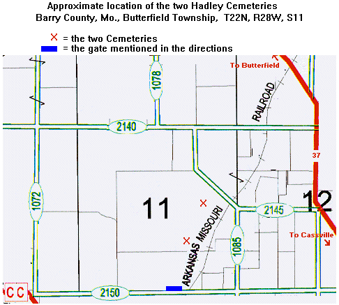 The John Hadley and the Henry Hadley Cemeteries are located at opposite corners of a pasture. The Hadley house was on the John Hadley property.