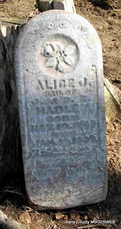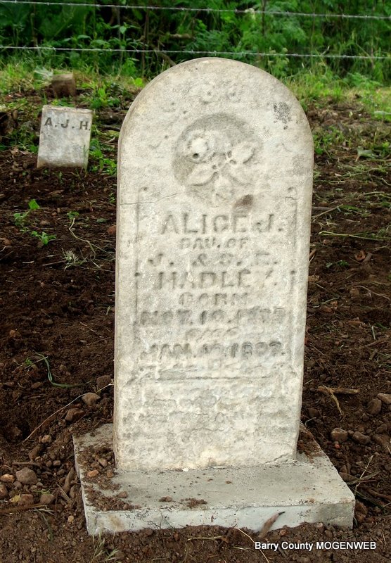 | HADLEY, Alice J. | Nov. 10, 1873 | Jan. 1, 1887 | Inscription: "Dau of J. & S. E." - Repaired Stone | Headstone Cheryl Cemetery Book, Vol III, p. 76, 1982, Joan Kunkel Photo Jack Fly |