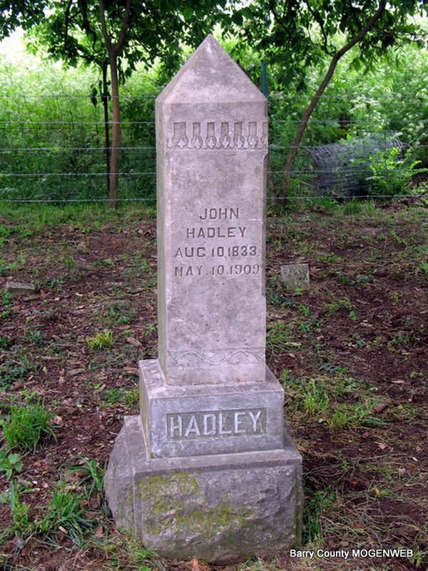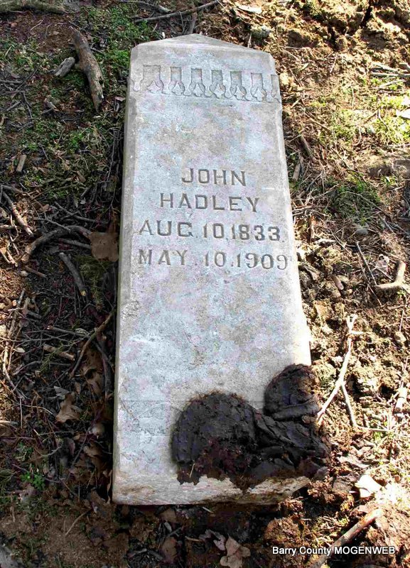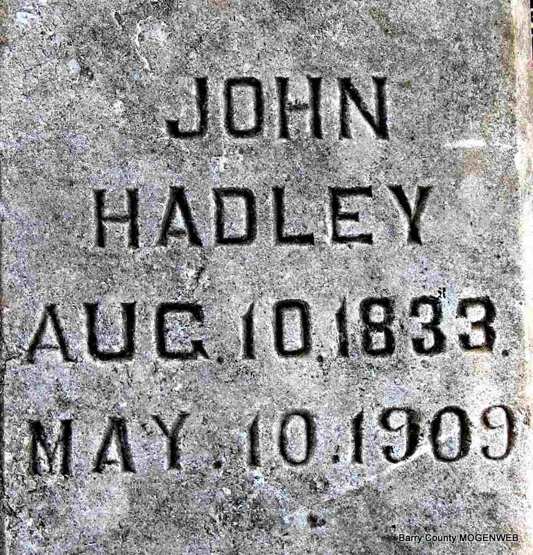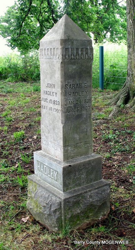 | HADLEY, John | Aug. 13, 1833 | May 10, 1909 | SSW: Sarah E. Hadley - Another Photo - Cleaned Stone - John & Sarah | Headstone Cheryl Photo Jack Fly |