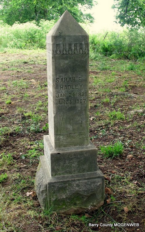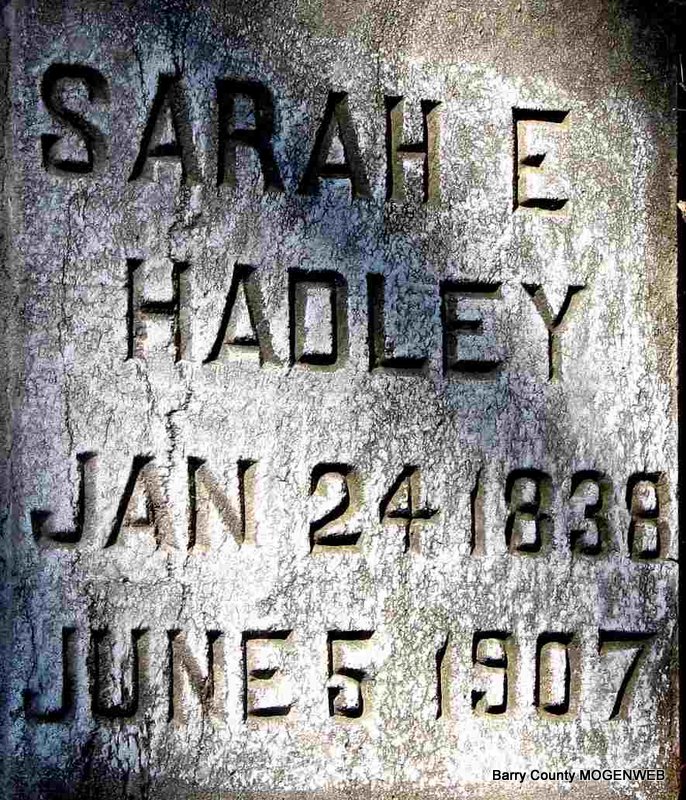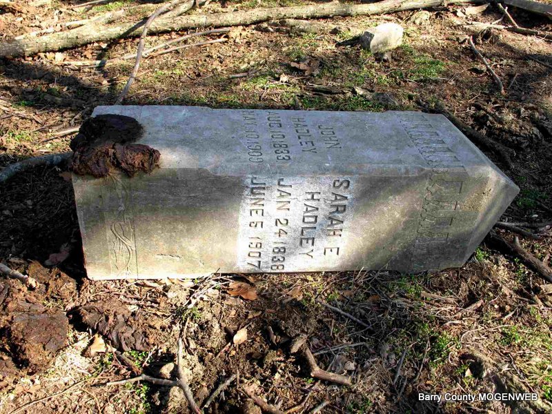 | HADLEY, Sarah E. (PHILLIPS) | Jan. 24, 1838 | June 5, 1907 | SSW: John Hadley - Research Note: Wife of John Hadley. - Another Photo - Another Photo - John & Sarah - See above the setting of this repaired stone. | Photo Jack Fly |