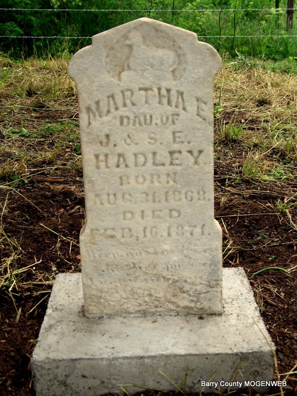 | HADLEY, Martha E. | Aug. 31, 1869 | Feb. 16, 1871 | Inscription: "Dau of J. & S. E." - Repaired Stone | Photo Jack Fly |